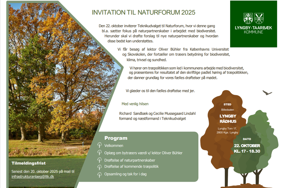Den 22. oktober inviterer Teknikudvalget til Naturforum, med fokus på naturpartnerskaber i arbejdet med biodiversitet. Herunder en drøftelse af forslag til nye naturpartnerskaber og hvordan de bedst kan understøttes.