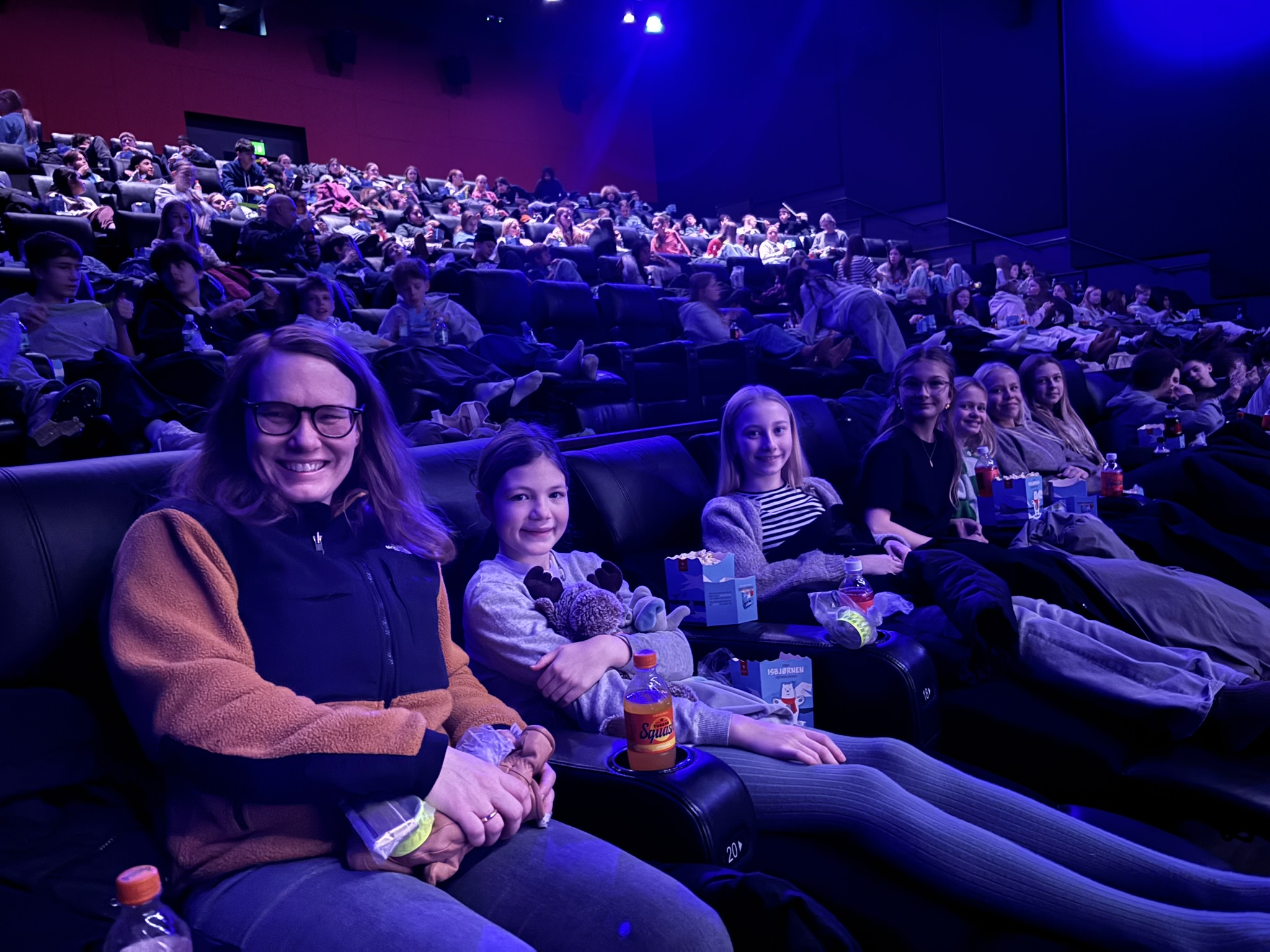 Kirsten Scharling er klasselærer for 6.X. på Lindegårdsskolen og sidder her i biografsalen sammen med seks af sine elever.
