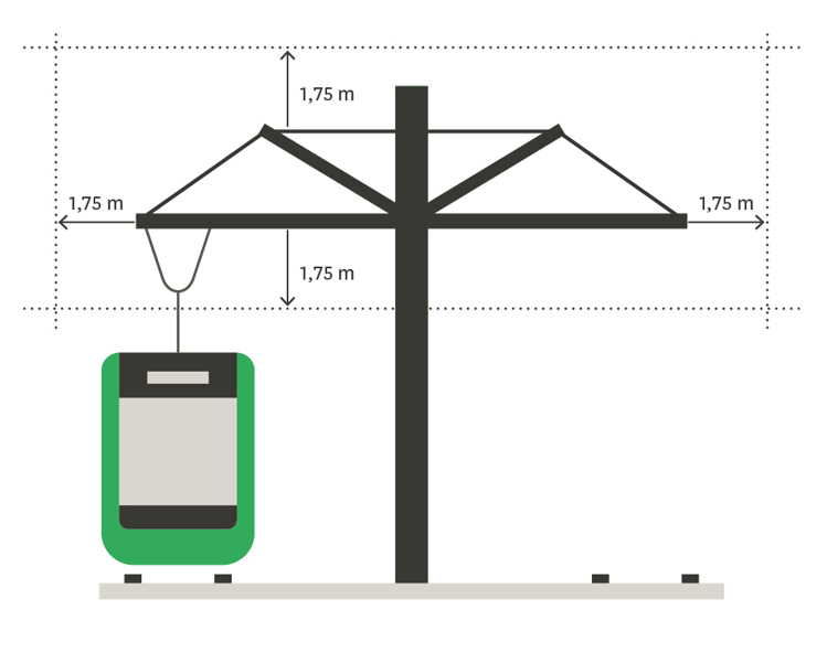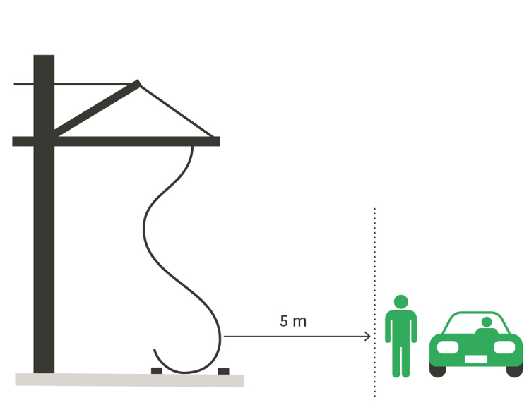 Letbanens køreledninger hænger i ca. 5,5 meters højde, så du kan ikke lige komme til at røre dem. Men vær under alle omstændigheder opmærksom på, at der altid skal holdes minimum 1,75 meters afstand til en køreledning. Letbanen kører på 750 volt jævnstrøm, og det er livsfarligt at komme for tæt på Letbanens kørestrøm.