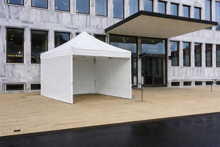 Derfor, bliver der stillet en pavillon op som vist på billedet, med en stemmeboks med ekstra plads magen til den, der plejer at stå indenfor hovedindgangen. Hermed er der mulighed for at stemme udenfor Rådhuset anonymt og i læ. Der bliver stillet et hævesænkebord og lup op indeni stemmeboksen.